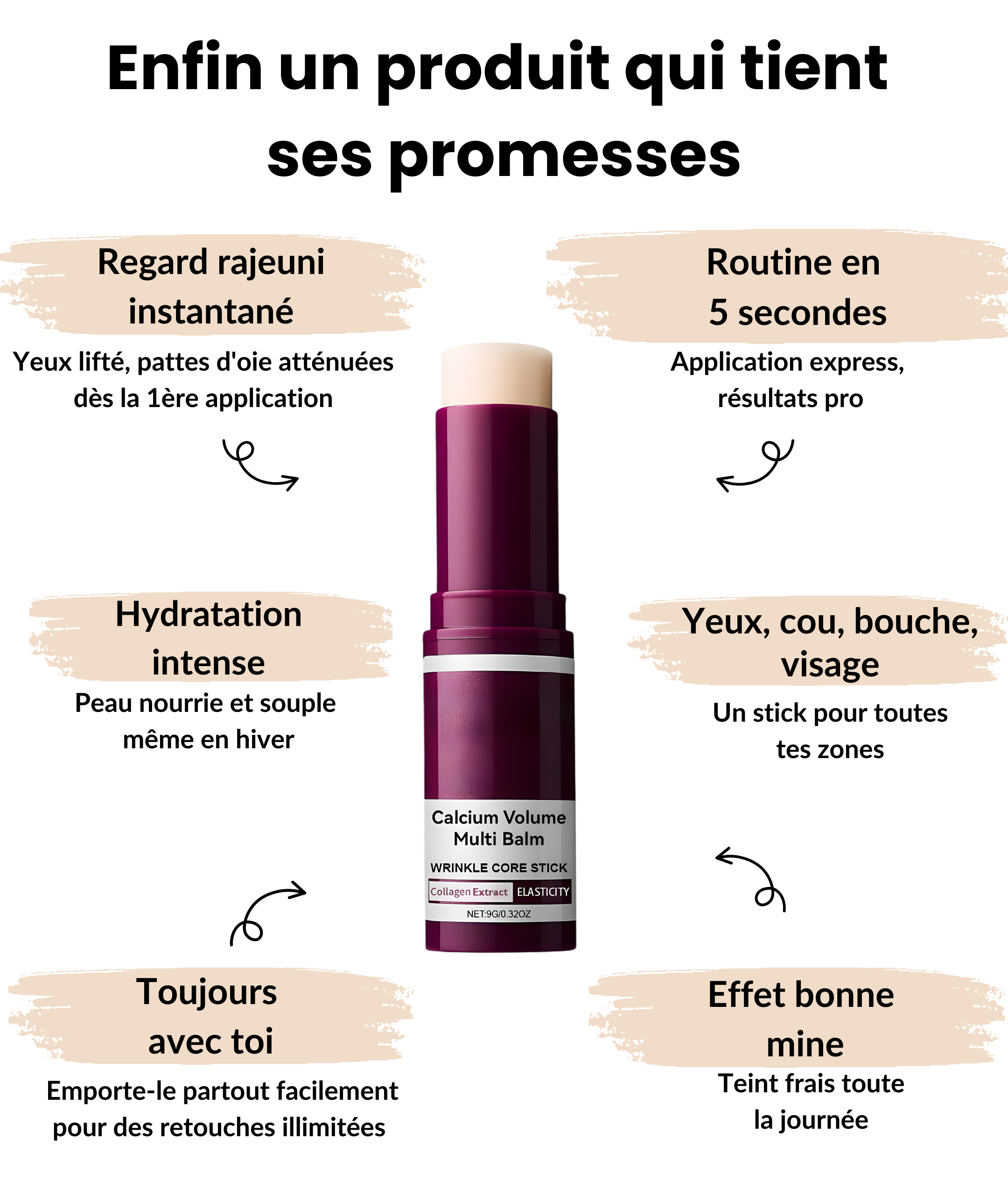 Un baume multi-usage au calcium et collagène en format stick, spécialement conçu pour réduire les rides, raffermir la peau et hydrater intensément le visage, le contour des yeux, le cou et les lèvres. Formule coréenne concentrée, application en 5 secondes.