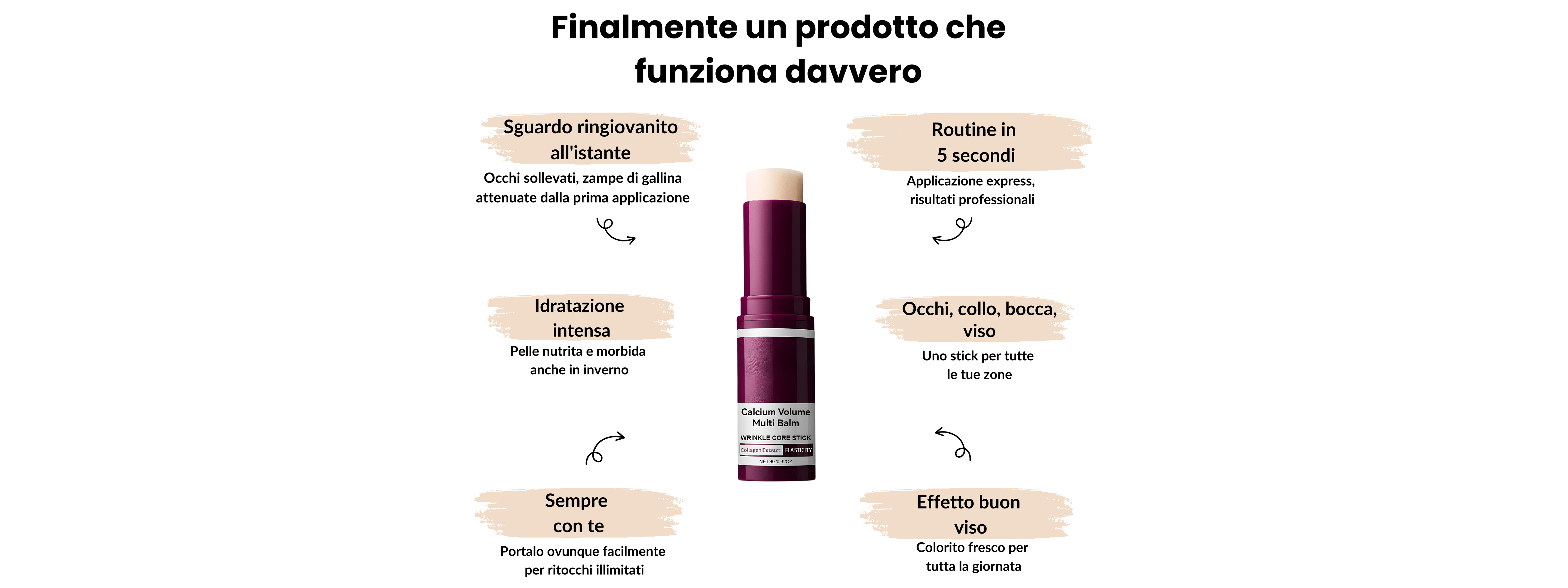 Un balsamo multiuso in stick al calcio e collagene, studiato specificamente per ridurre le rughe, rassodare la pelle e idratare intensamente viso, contorno occhi, collo e labbra. Formula coreana concentrata, si applica in 5 secondi.